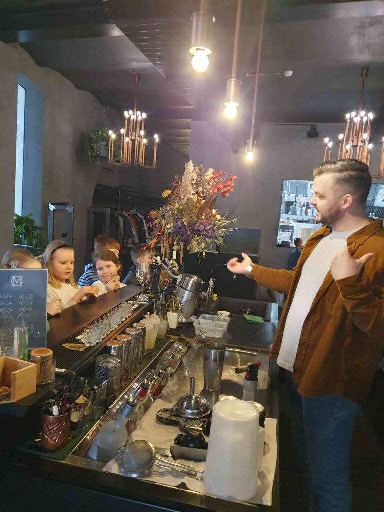 Pie bāra letes mūs sagaidīja bārmenis, kurš demonstrēja, kā top krāsains un veselīgs bezalkoholiskais dzēriens. Skolēni pārliecinājās, ka bārmeņa darbā nepieciešama gan precizitāte, gan lieliska atmiņa.